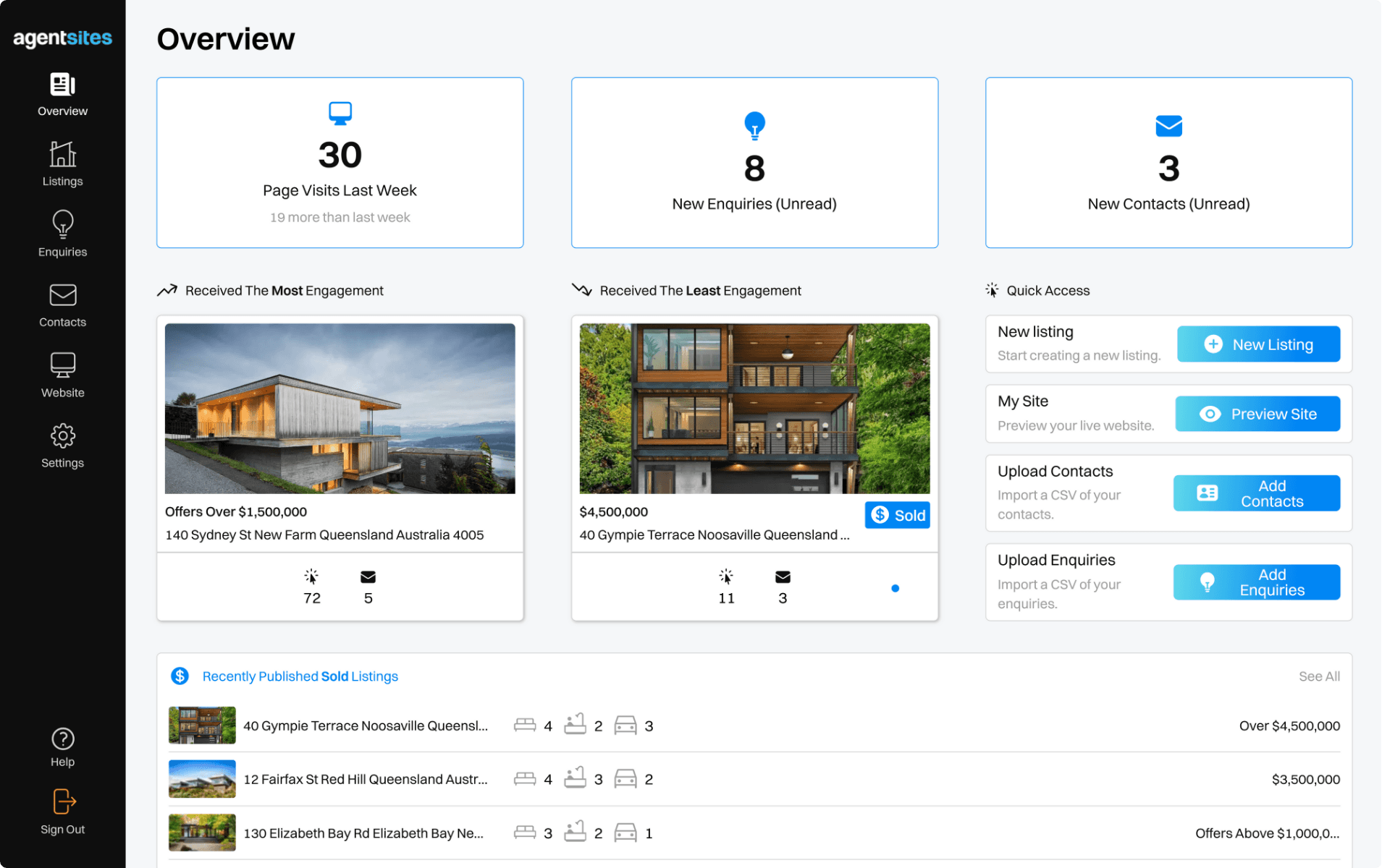 AgentSites is an online marketing platform designed specifically for real estate agents, allowing you to instantly create a professional website to market your personal brand. Each site includes tools to customise branding, manage listings, capture enquiries and leads, and publish social media content from one place.